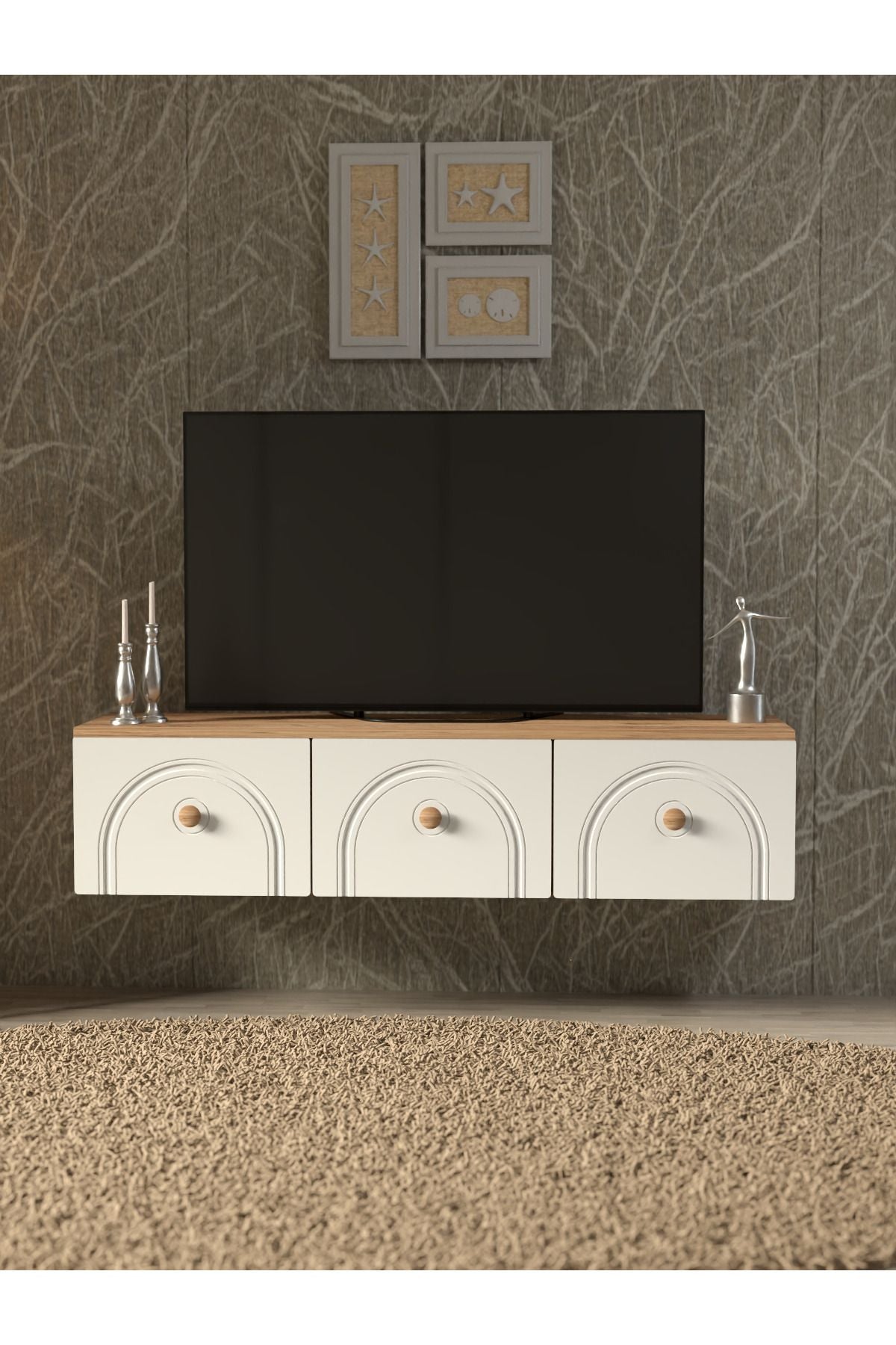 Boho Duvar TV Ünitesi, kemerli kapak detayları ve duvara asılı formuyla mekâna hafif ve karakterli bir görünüm kazandırır.