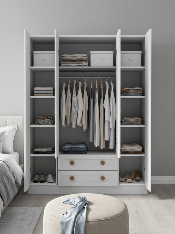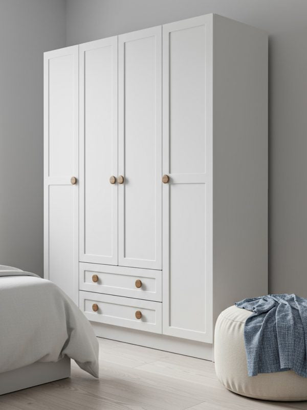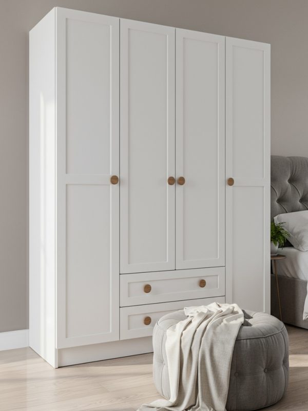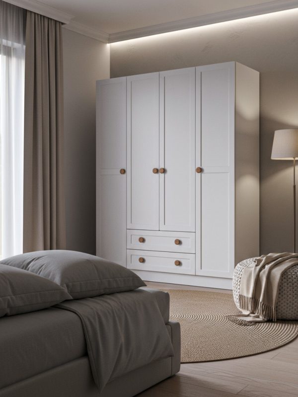 Bu 4 kapaklı giysi dolabı, sade formu ve aynasız yapısıyla farklı yaşam alanlarında kullanılabilecek zamansız bir depolama çözümüdür. Özellikle çocuk odalarında, fazla detayla kalabalık yapmadan düzen kurmak isteyenler için iyi bir temel parça oluşturur.