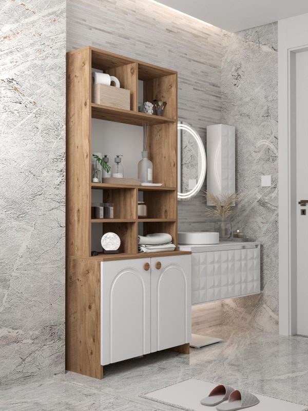 Bohem Banyo Dolabı, açık rafları ve kapaklı alt bölümüyle banyoda düzeni sade bir şekilde kurar.