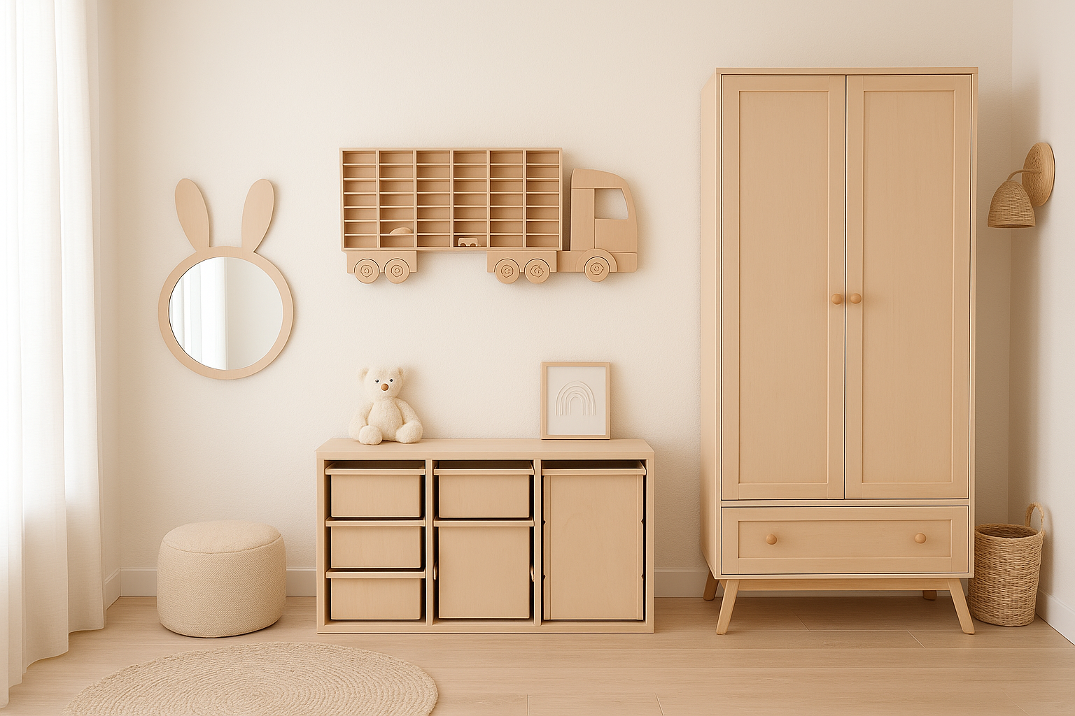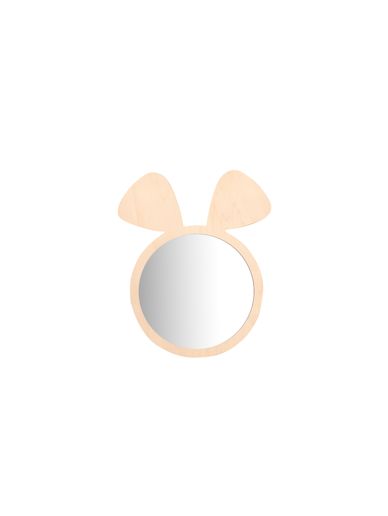 Fare ayna, doğal huş kontraplak çerçevesi ve sade formuyla çocuk odalarına yumuşak bir karakter katar.