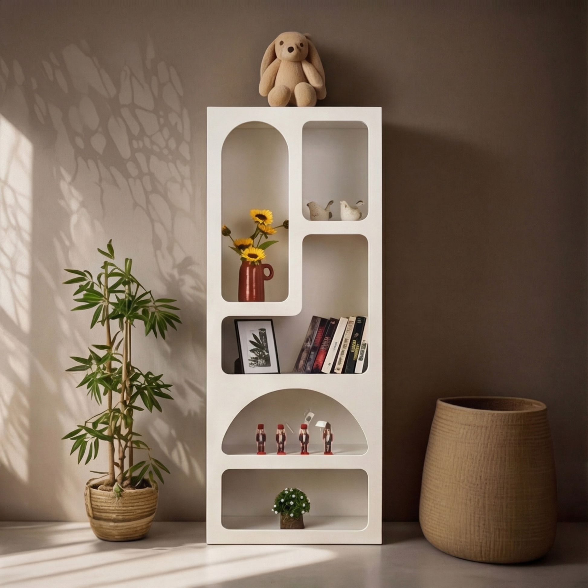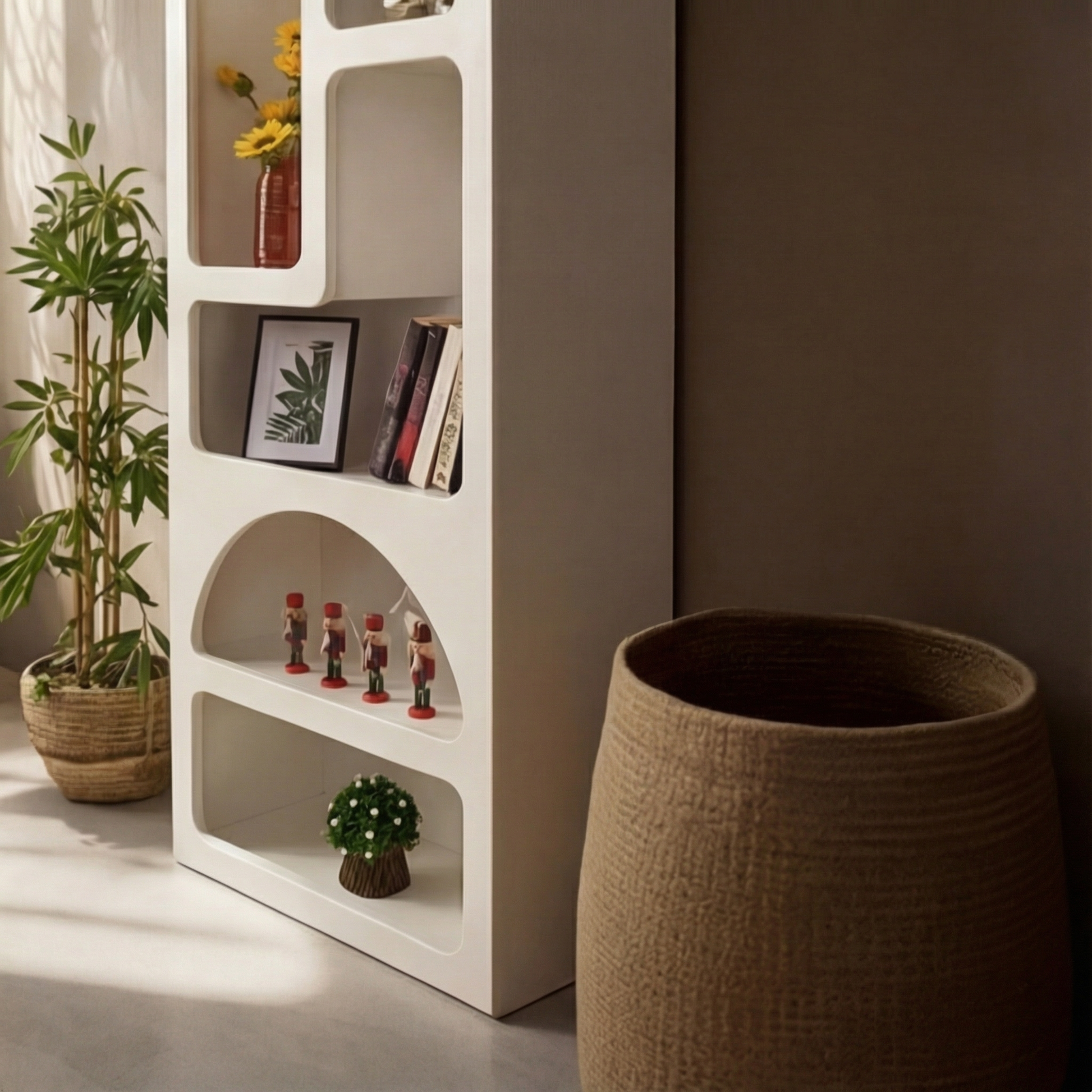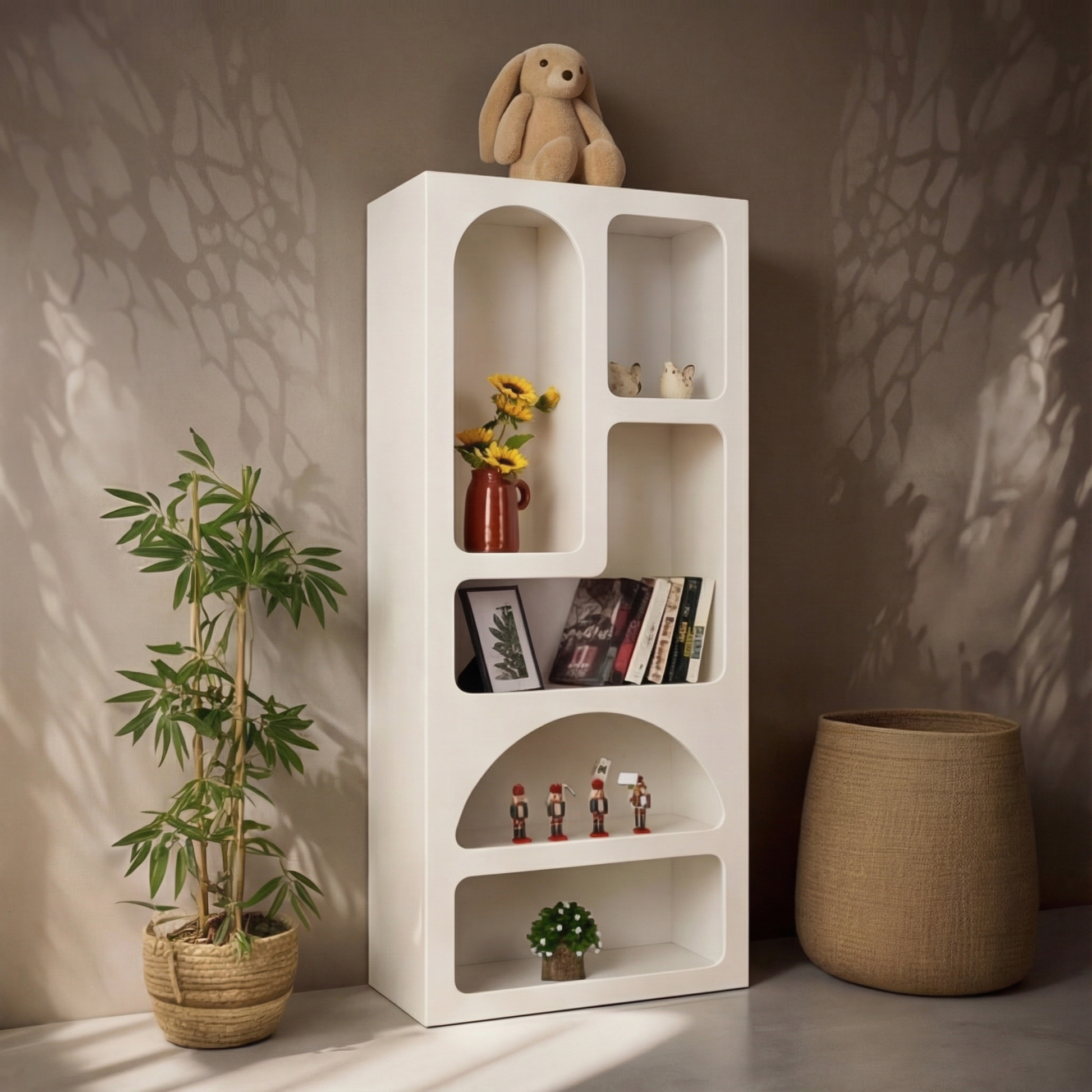 Köşesiz ve akışkan formuyla bulunduğu mekâna yumuşak ama karakterli bir duruş kazandırır. Açık raf yapısı sayesinde hem sergileme hem depolama ihtiyacını aynı anda karşılar. Çocuk odasından salona kadar farklı alanlarda rahatlıkla kullanılabilir.